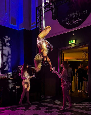 In een hoepel of sling zullen onze acrobaten uw gasten op unieke en luxe wijze ontvangen door vanuit de lucht de champagneglazen bij te vullen.